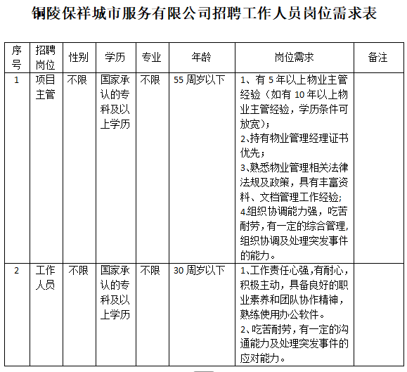 因業(yè)務(wù)發(fā)展需要,銅陵保祥城市服務(wù)有限公司面向社會(huì)公開招聘工作人員2名。具體事項(xiàng)公告如下: